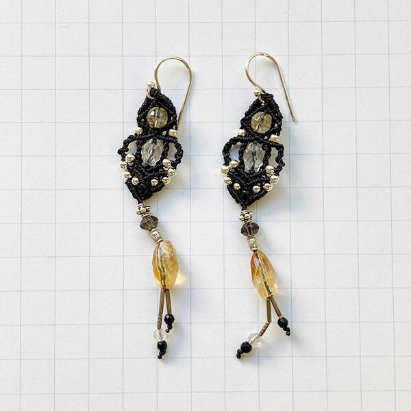 11月の誕生石でもあり幸福と繁栄をもたらすとされているシトリンを黒のナイロンと組み合わせた大人の雰囲気のピアスです。